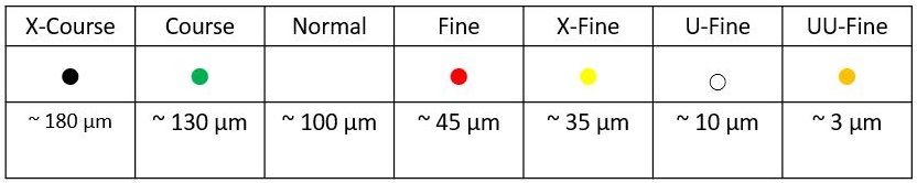 Unterschiedliche Anwendungen wie Präparieren oder Finieren erfordern oft unterschiedliche Feinheiten des Diamantkorns. Daher bieten wir unsere Instrumente mit einer Bandbreite von Extra-grob ~190 µm bis Ultra-fein ~3 µm Körnung an. |